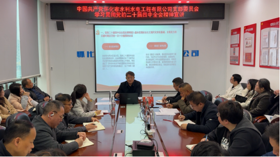 2025年12月29日上午,懷化市產(chǎn)業(yè)投資集團有限公司黨委副書記、總經(jīng)理王旭一行赴水利水電工程公司,以《深學(xué)細悟全會精神 勇?lián)母锇l(fā)展使命 奮力書寫懷化產(chǎn)投集團高質(zhì)量發(fā)展新篇章》為主題,開展黨的二十屆四中全會精神專題宣講,公司在家全體員工參會。
