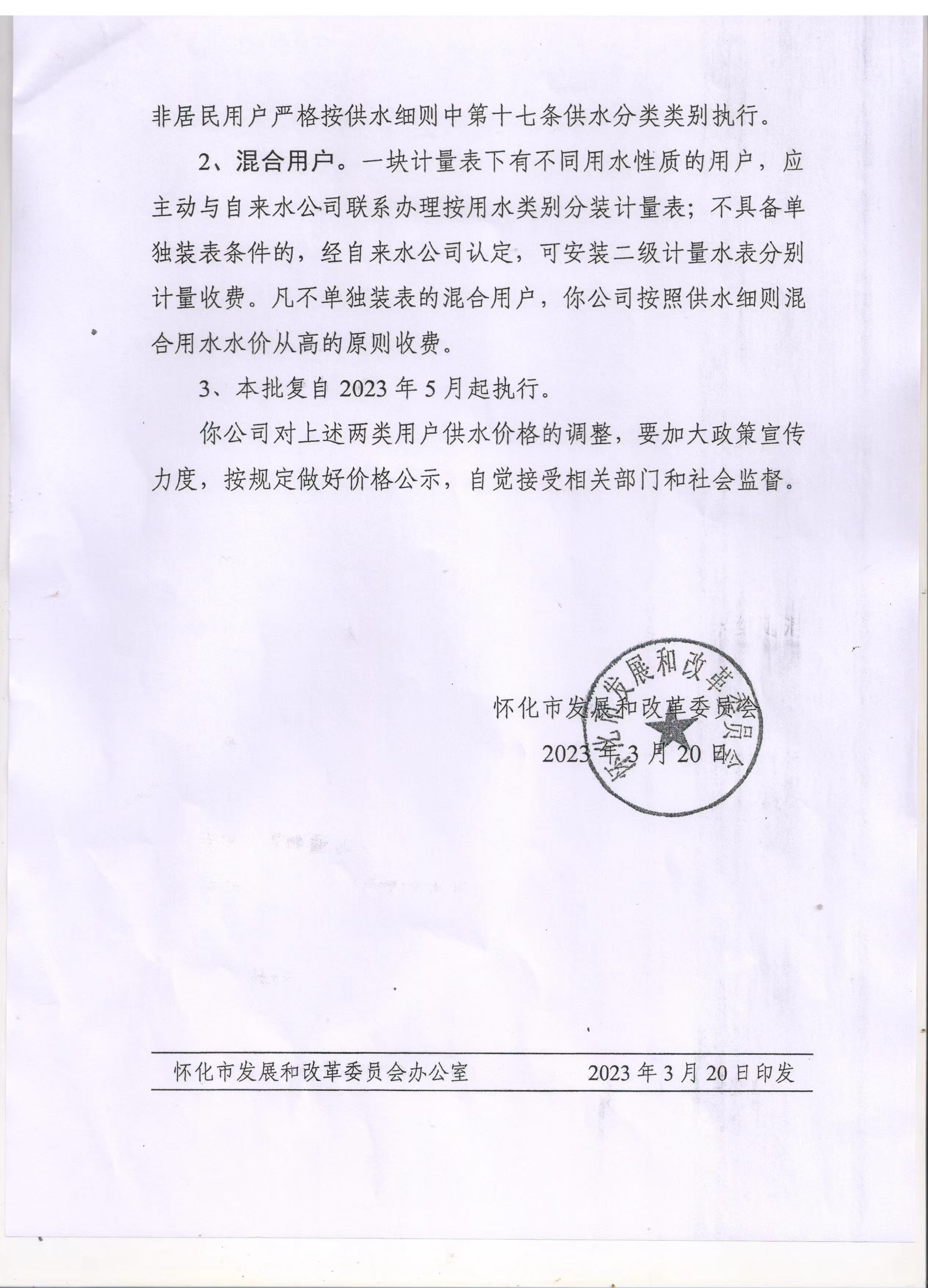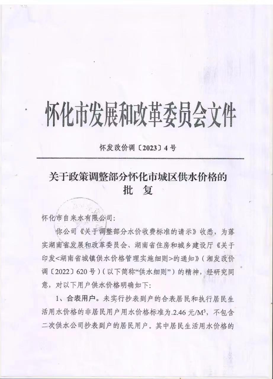 懷化市自來水有限公司—關(guān)于政策調(diào)整部分懷化市城區(qū)供水價(jià)格的批復(fù)